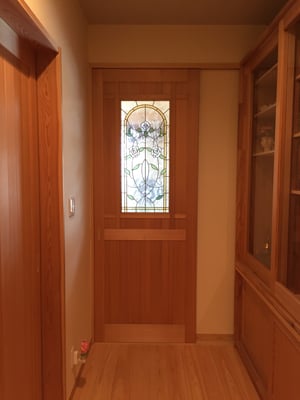 日光の良く当たるリビングのドアに取り付けたので、やや暗い廊下側からの眺めがよく映える。